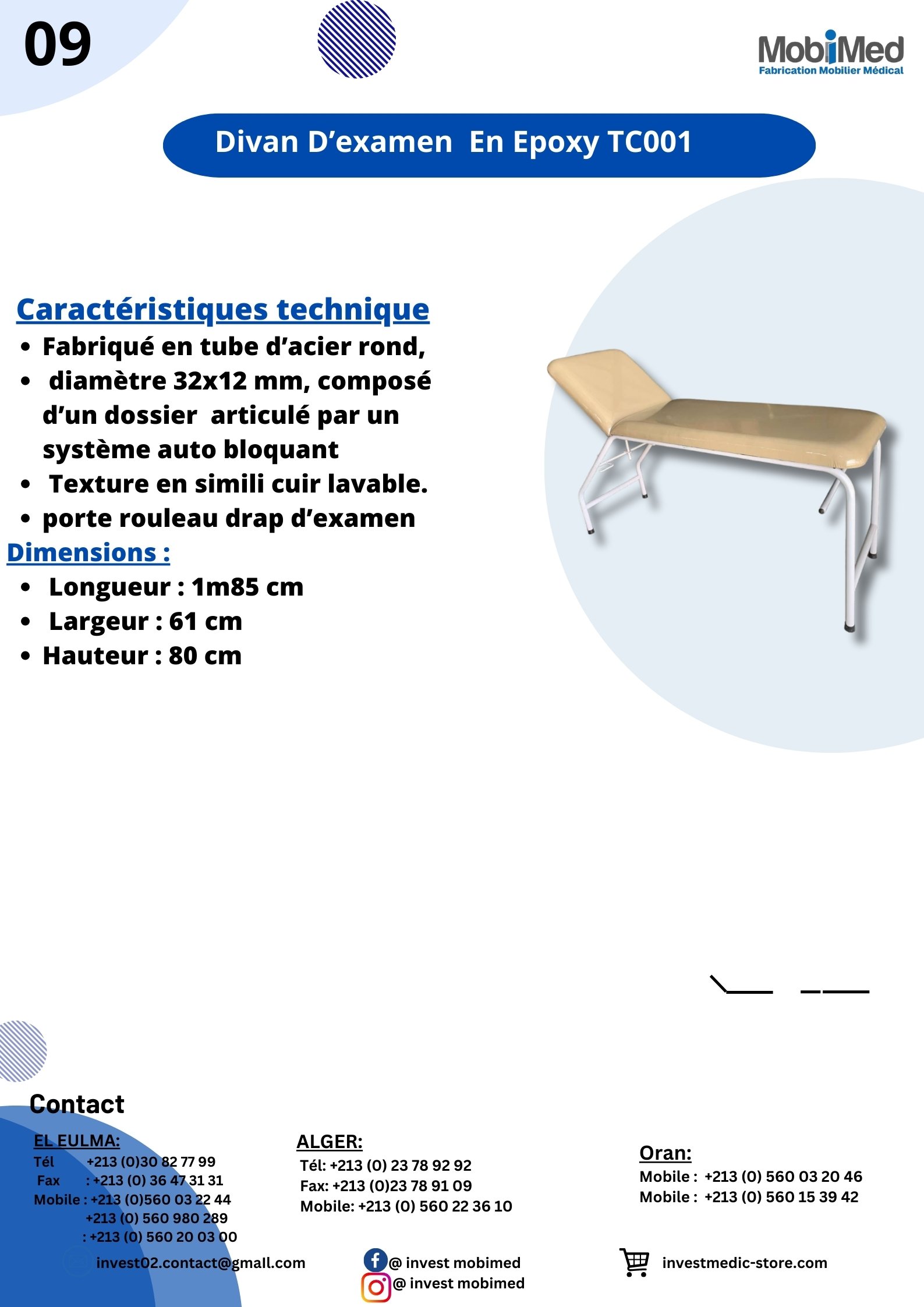 Accueil Mobilier Médical / Invest Mobimed Divan D’examen En Epoxy TC001 Divan D’examen En Epoxy TC001 Fiche Technique Catégories : Mobilier Médical / Invest Mobimed, Mobimed Produits similaires Table De Consultation Pour Nouveau Née En Epoxy TCN01 Mobilier Médical / Invest Mobimed, MobimedLire la suite Fauteuil de Dialyse Electrique FDE01 Mobilier Médical / Invest Mobimed, MobimedLire la suite Divan Gynécologique En Epoxy Etrier En Acier TG 001 Mobilier Médical / Invest Mobimed, MobimedLire la suite Chaise Massage et Hidjama Pliable CMH01 Mobilier Médical / Invest Mobimed, MobimedLire la suite