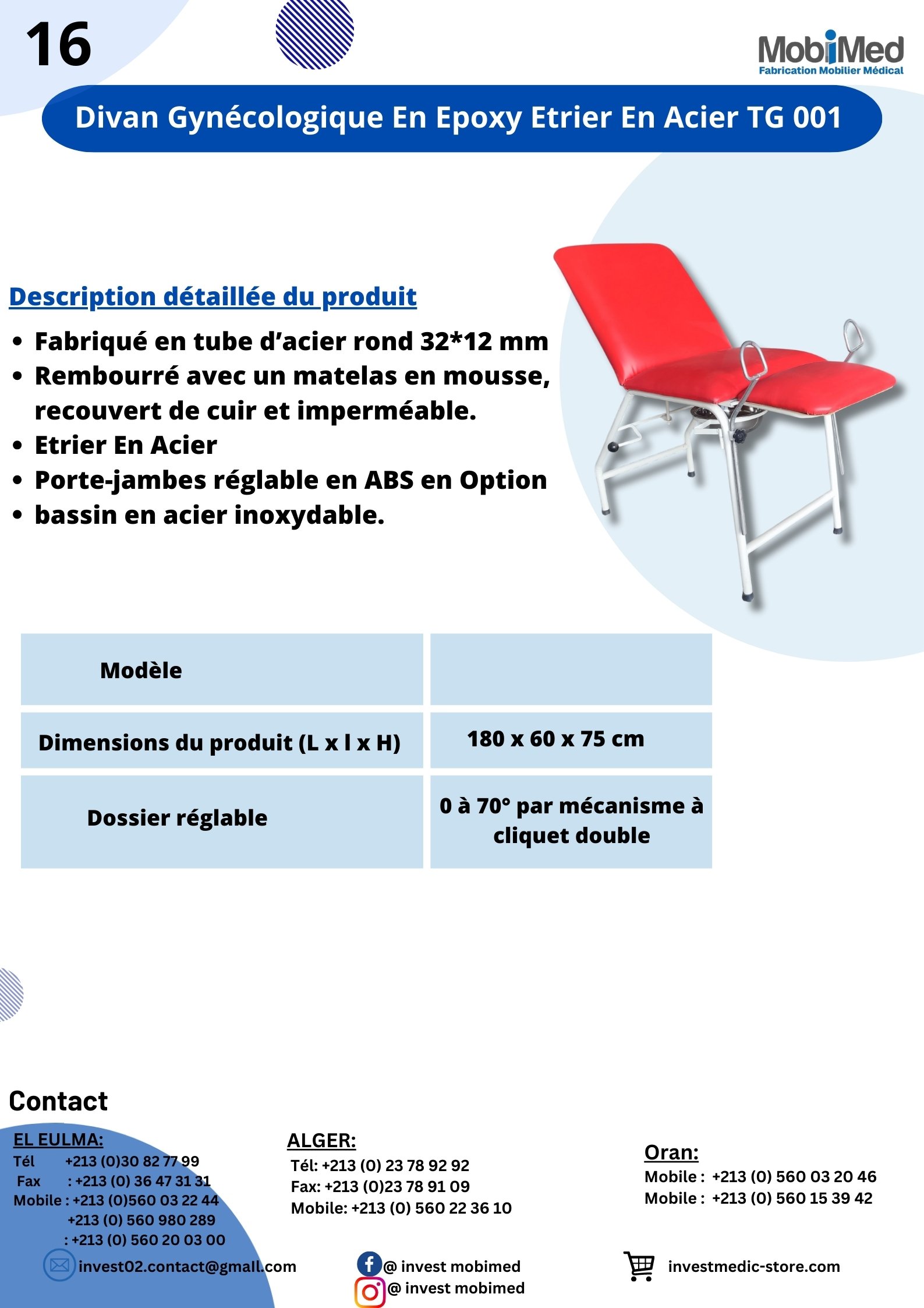 Accueil Mobilier Médical / Invest Mobimed Divan Gynécologique En Epoxy Etrier En Acier TG 001 Divan Gynécologique En Epoxy Etrier En Acier TG 001 Fiche Technique Catégories : Mobilier Médical / Invest Mobimed, Mobimed Produits similaires Divan Gynécologique En Epoxy Jambières En Mousse TG 003 Mobilier Médical / Invest Mobimed, MobimedLire la suite Fauteuil Relax Et Esthétique électrique En Epoxy A 3 position Hauteur Variable FR002 Mobilier Médical / Invest Mobimed, MobimedLire la suite Fauteuil Garde Malade FGM01 Mobilier Médical / Invest Mobimed, MobimedLire la suite Divan D’examen Electrique a Hauteur Variable TCE02 Mobilier Médical / Invest MobimedLire la suite