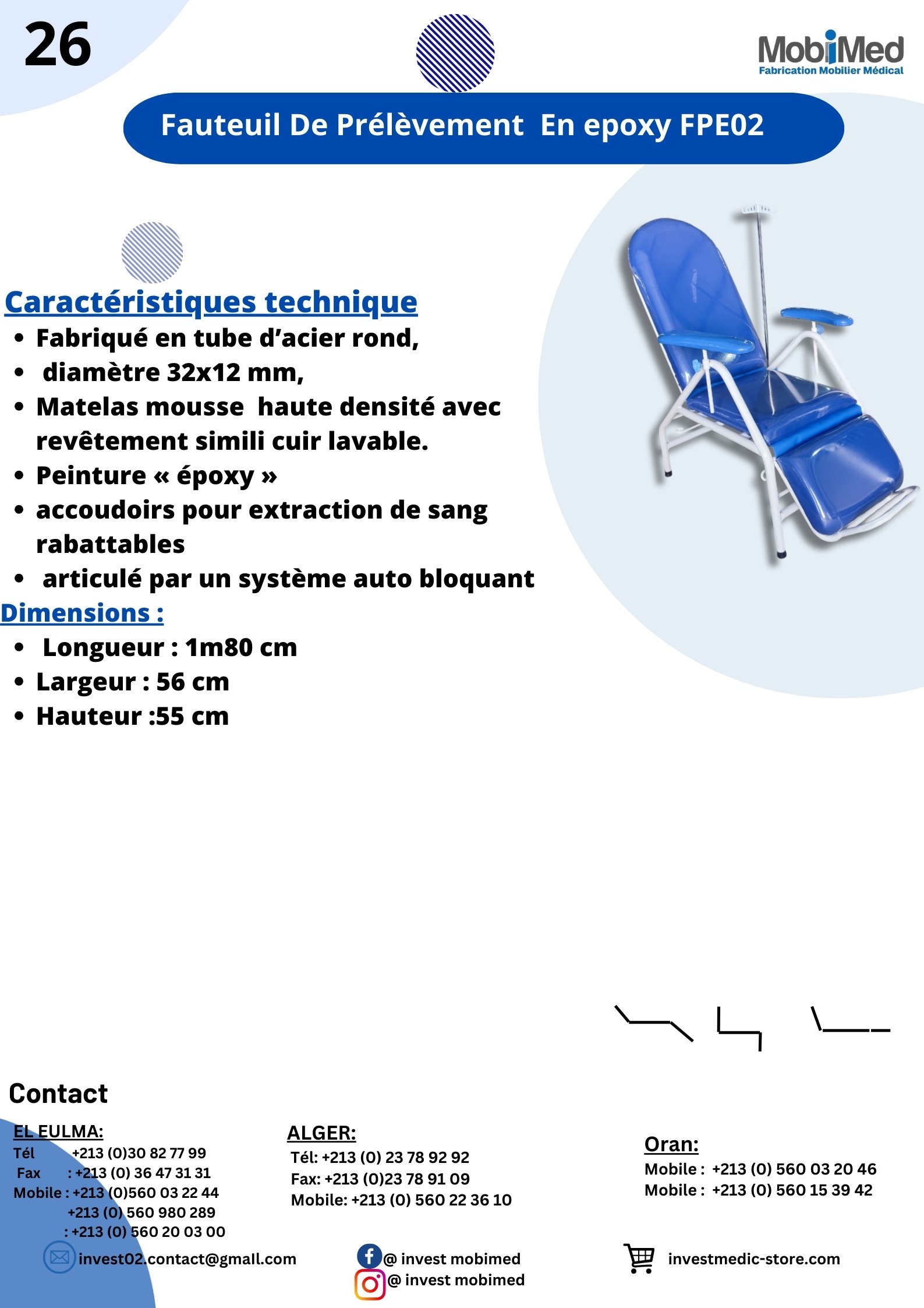 Accueil Mobilier Médical / Invest Mobimed Fauteuil De Prélèvement En époxy FPE02 Fauteuil De Prélèvement En époxy FPE02 Fiche Technique Catégories : Mobilier Médical / Invest Mobimed, Mobimed Produits similaires Fauteuil Relax Et Esthétique électrique En Epoxy A 3 position Hauteur Variable FR002 Mobilier Médical / Invest Mobimed, MobimedLire la suite Fauteuil Relax et esthétique Electrique FR004 Mobilier Médical / Invest Mobimed, MobimedLire la suite Divan D’examen Avec Troue En Epoxy TCT02 Mobilier Médical / Invest Mobimed, MobimedLire la suite Chariot Brancard CB01 Mobilier Médical / Invest Mobimed, MobimedLire la suite