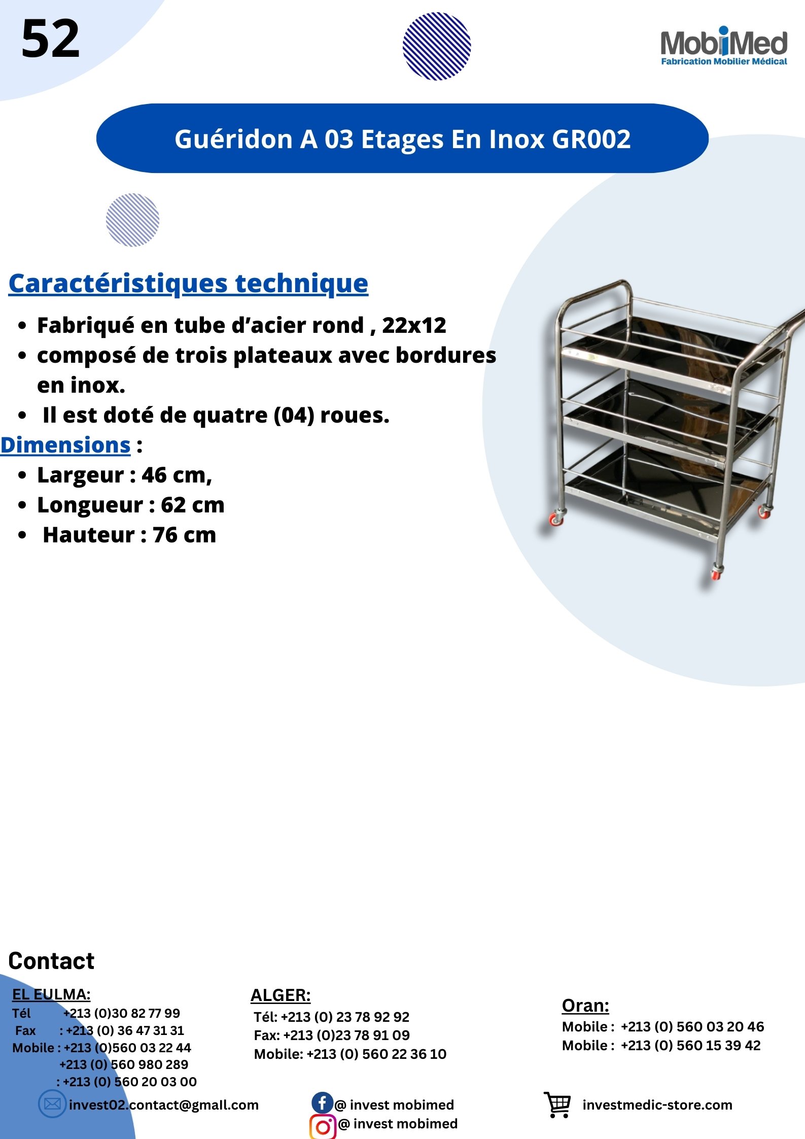 Accueil Mobilier Médical / Invest Mobimed Guéridon A 03 Etages En Inox GR002 Guéridon A 03 Etages En Inox GR002 Fiche Technique Catégories : Mobilier Médical / Invest Mobimed, Mobimed Produits similaires Chaise Massage et Hidjama Pliable CMH01 Mobilier Médical / Invest Mobimed, MobimedLire la suite Divan Gynécologique En Epoxy Jambières En Mousse TG 003 Mobilier Médical / Invest Mobimed, MobimedLire la suite Table De Consultation Pour Nouveau Née En Epoxy TCN01 Mobilier Médical / Invest Mobimed, MobimedLire la suite Fauteuil Relax Et Esthétique électrique En Epoxy A 3 position Hauteur Variable FR002 Mobilier Médical / Invest Mobimed, MobimedLire la suite