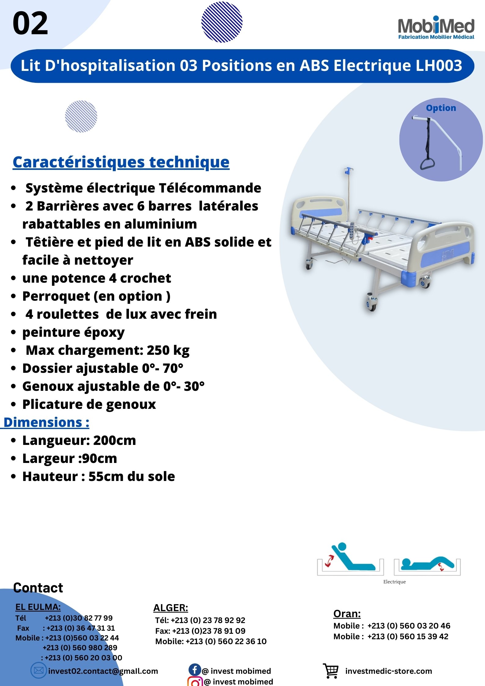 Accueil Mobilier Médical / Invest Mobimed Lit D’hospitalisation 03 Positions en ABS Electrique LH003 Lit D’hospitalisation 03 Positions en ABS Electrique LH003 Fiche Technique Catégorie : Mobilier Médical / Invest Mobimed Produits similaires Chariot Brancard CB01 Mobilier Médical / Invest Mobimed, MobimedLire la suite Fauteuil de Dialyse Electrique FDE01 Mobilier Médical / Invest Mobimed, MobimedLire la suite Fauteuil De Prélèvement En époxy FPE02 Mobilier Médical / Invest Mobimed, MobimedLire la suite Divan D’examen Pliable Chromé TCC01 Mobilier Médical / Invest Mobimed, MobimedLire la suite