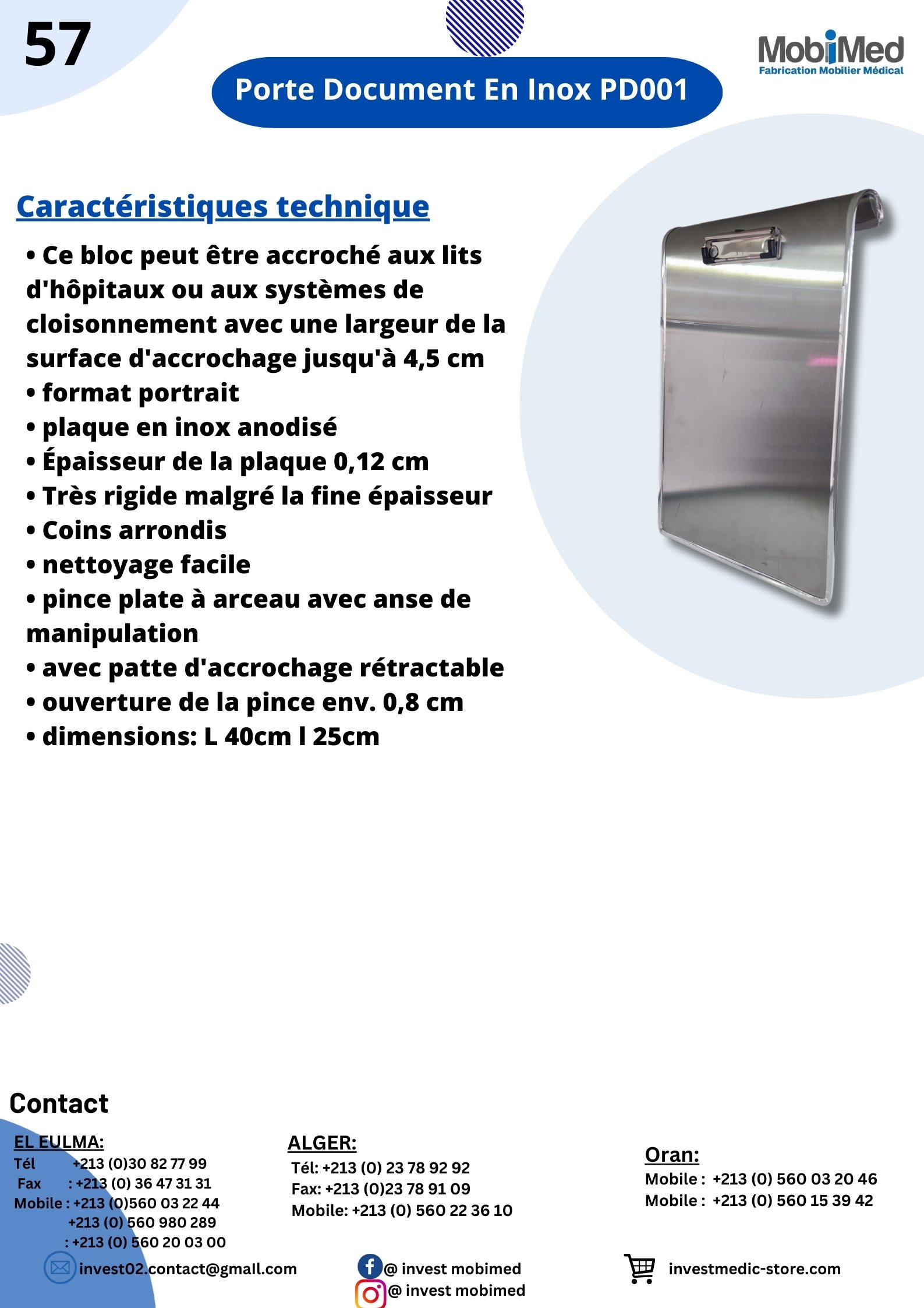 Accueil Mobilier Médical / Invest Mobimed Porte Document En Inox PD001 Porte Document En Inox PD001 Fiche Technique Catégories : Mobilier Médical / Invest Mobimed, Mobimed Produits similaires Lit D’hospitalisation 01 Position LH001 Mobilier Médical / Invest MobimedLire la suite Berceau Bebe En ABS Avec Matelas BR-001 Mobilier Médical / Invest Mobimed, MobimedLire la suite Fauteuil De prélèvement Chromé FPC01 Mobilier Médical / Invest Mobimed, MobimedLire la suite Chaise Massage et Hidjama Pliable CMH01 Mobilier Médical / Invest Mobimed, MobimedLire la suite