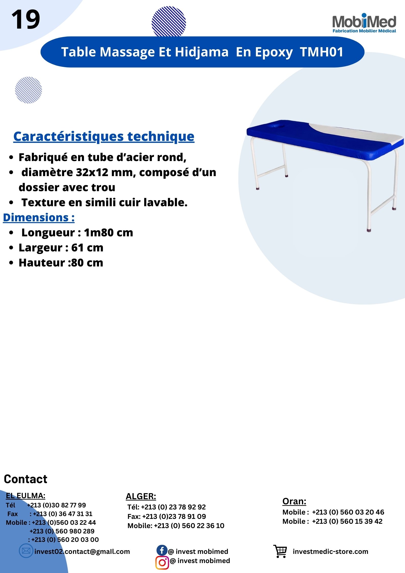 Accueil Mobilier Médical / Invest Mobimed Table Massage Et Hidjama En Epoxy TMH01 Table Massage Et Hidjama En Epoxy TMH01 Fiche Technique Catégories : Mobilier Médical / Invest Mobimed, Mobimed Produits similaires Fauteuil Garde Malade FGM01 Mobilier Médical / Invest Mobimed, MobimedLire la suite Table De Consultation Pour Nouveau Née En Epoxy TCN01 Mobilier Médical / Invest Mobimed, MobimedLire la suite Fauteuil De Prélèvement En époxy FPE02 Mobilier Médical / Invest Mobimed, MobimedLire la suite Fauteuil Relax Et Esthétique En Epoxy FR002 Mobilier Médical / Invest Mobimed, MobimedLire la suite
